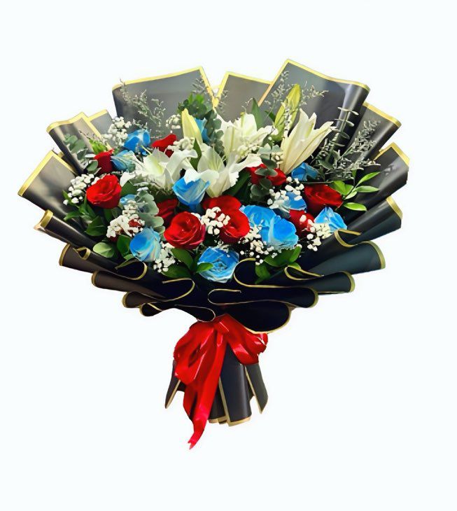 Buket Aiko memadukan mawar merah, mawar biru, lili putih, dedaunan hijau segar, dan baby’s breath putih lembut dalam satu rangkaian yang memukau. Selain itu, mawar merah melambangkan cinta yang bergairah, sementara mawar biru menandakan kesetiaan. Di sisi lain, lili putih menyimbolkan kemurnian yang abadi. Kombinasi ini menciptakan harmoni warna yang menyentuh hati. Lebih lanjut, dedaunan hijau segar dan baby’s breath menambahkan sentuhan romantis. Sebagai pelengkap, pembungkus hitam dengan aksen emas semakin menonjolkan kesan mewah dan elegan.