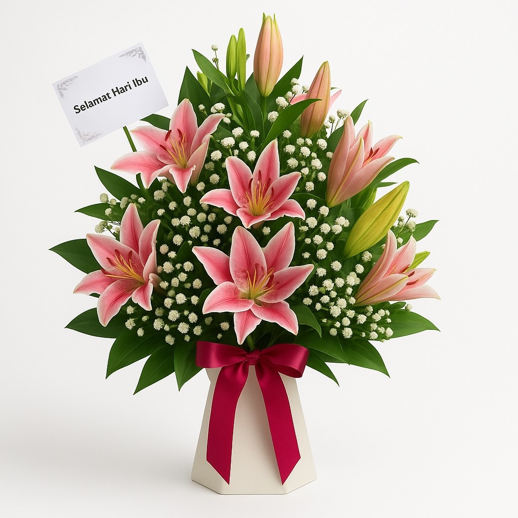 Lili: Pertama-tama, bunga lili berwarna merah muda mendominasi buket ini dan memberikan kesan anggun serta mewah. Lili sering melambangkan kemurnian, keindahan, dan cinta.