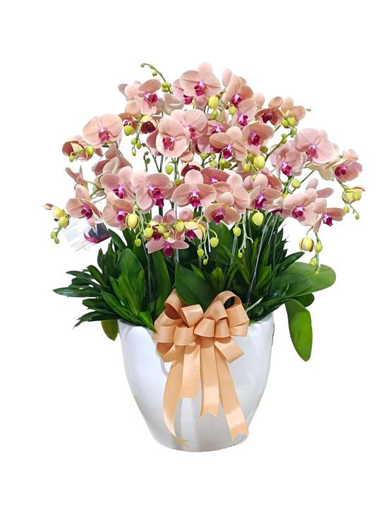 Pot Bunga: Buket ini hadir dalam pot berwarna putih yang elegan, sehingga memberikan kesan bersih dan modern. Pot ini juga berfungsi sebagai wadah kokoh untuk tanaman anggrek.